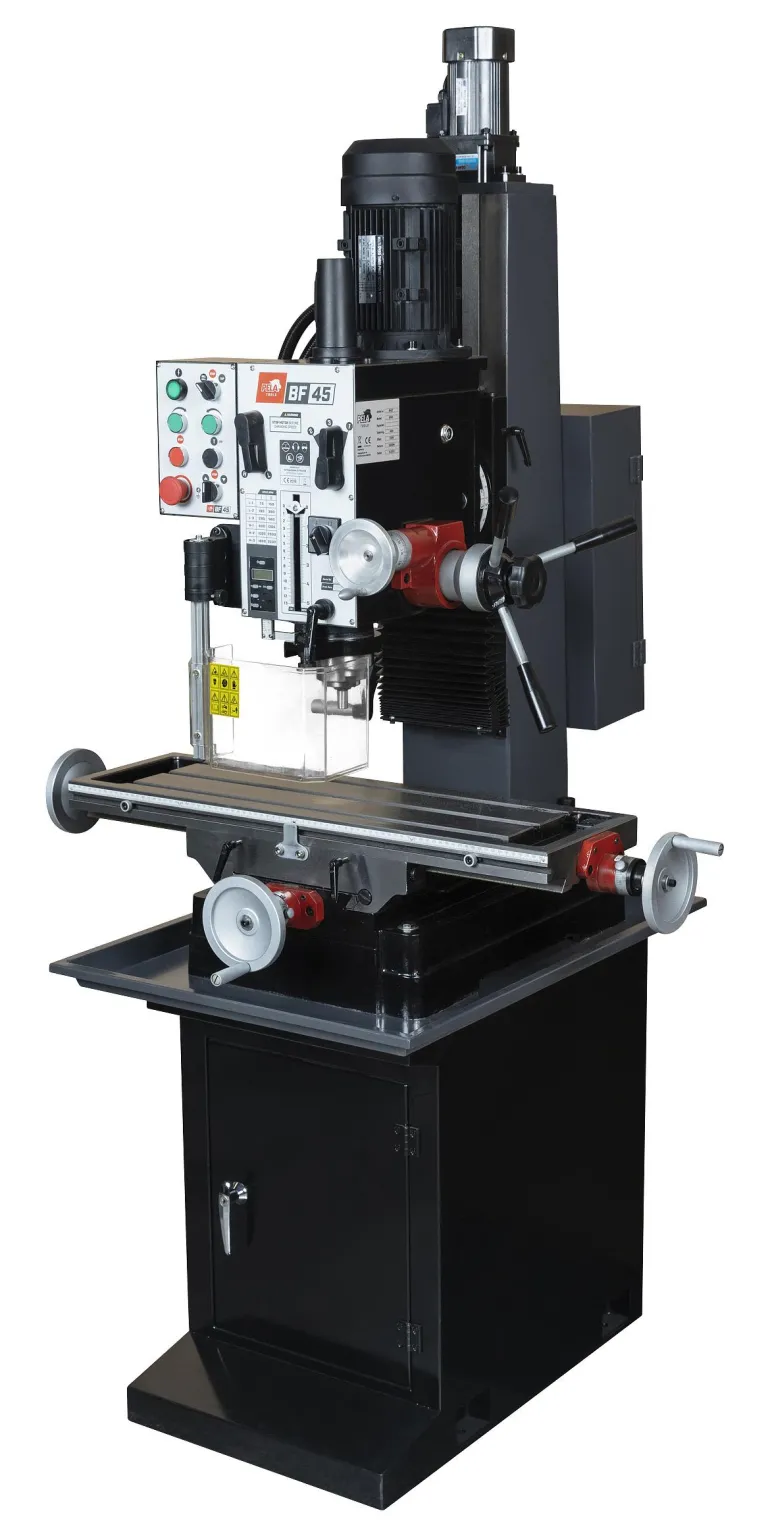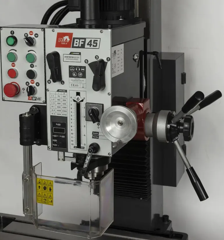 PELA BF45 on penkkijyrsinkone ja porakone. Ilman digitaalisia laskureita. Poraus-/jyrsintäpäätä nostetaan/lasketaan nostomoottorilla lohenpyrstöohjaimen avulla. Soveltuu poraukseen ja pieniin jyrsintätehtäviin. Varustettu 2-nopeuksisella moottorilla, jossa on moottorin suojaus. 6-vaihteinen vaihteisto. Porapäätä voidaan kallistaa 0-90° vasemmalle ja oikealle. Mukana vetotanko M12x1,75 mm ja erilaisia työkaluja.