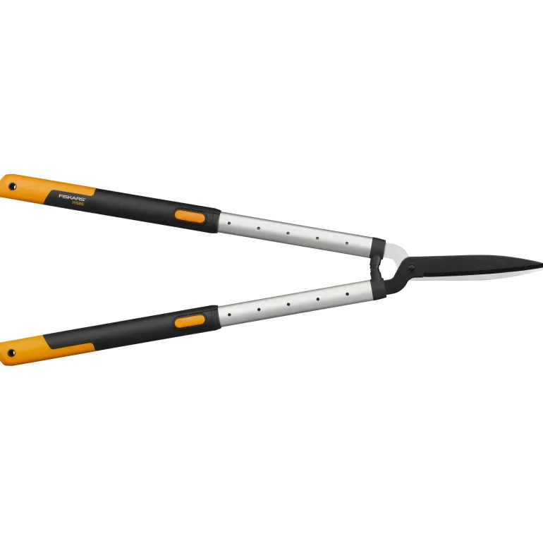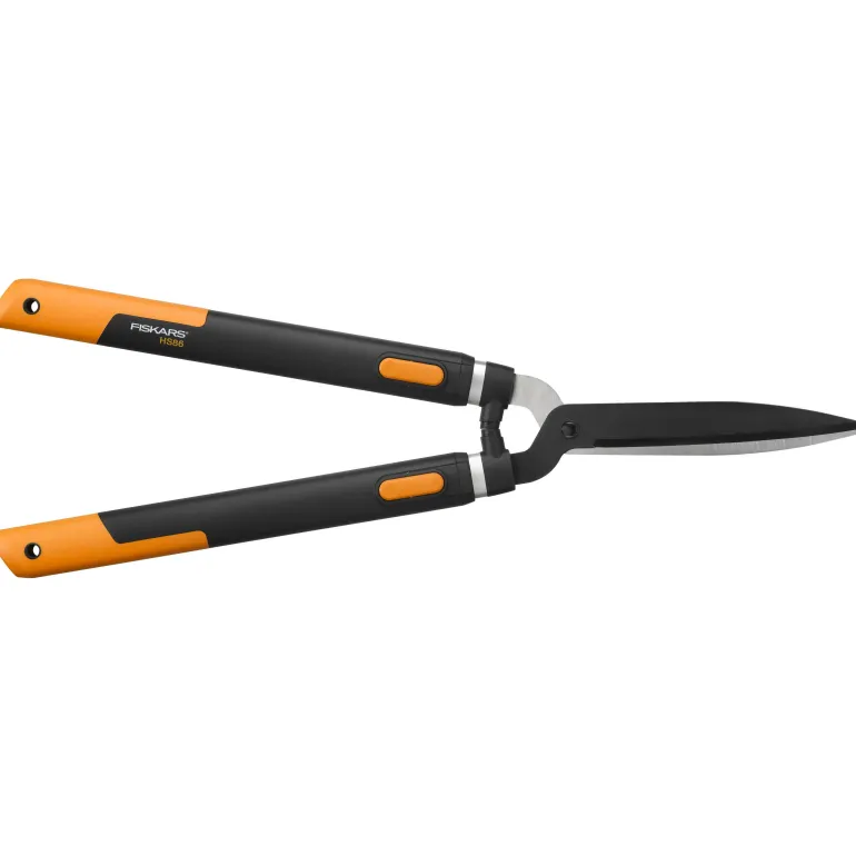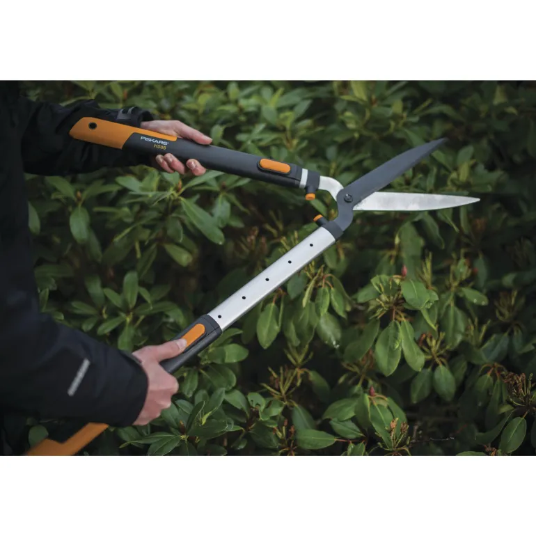 Fiskars SmartFit -pensasleikkureissa on terävä ja kiinteä terä karkaistua hiiliterästä ja kitkaton pinnoite yläterällä. Kahvojen oransseilla painikkeilla hallittavat teleskooppitoiminnot antavat hieman ylimääräistä ulottuvuutta, kun leikkaat suurempia tai korkeampia pensasaitoja.