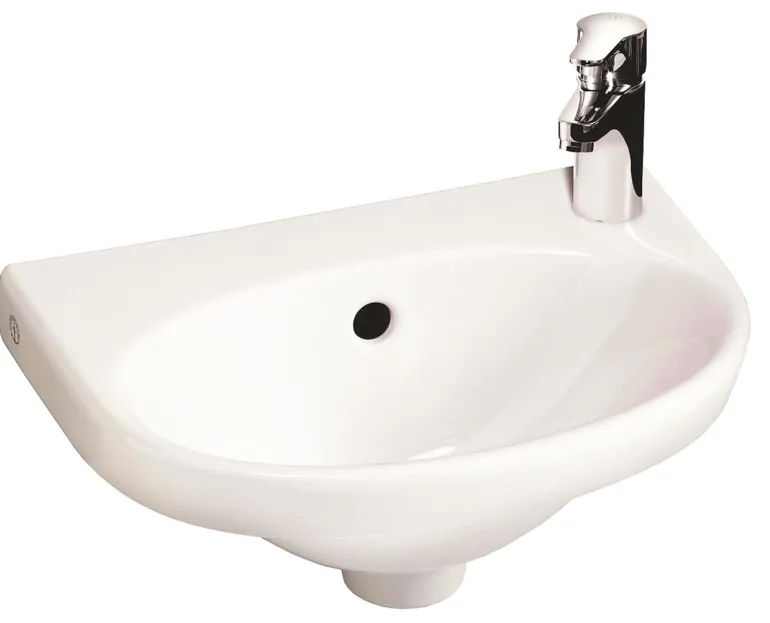 Pesuallas, jossa ylivuotoaukko ja sekoittimen reikä vasemmalla. Ihanteellinen ahtaisiin tiloihin. Allas on ulkomitoiltaan 400 x 275 mm (L x S) ja sisämitoiltaan 350 x 200 mm.