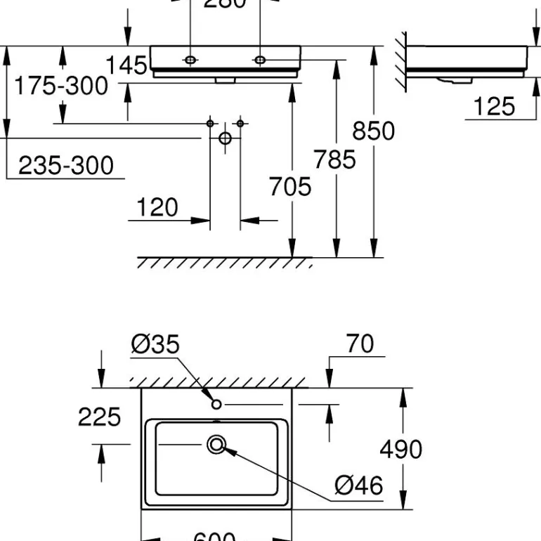 Seinään kiinnitettävä pesuallas, jonka koko on 600 x 490 mm ja jossa on ylivuotoaukko. Pesuallas on valmistettu hienosta tulenkestävästä savesta, ja siinä on antibakteerinen PureGuard-pinnoite ja antibakteerinen lasitus.