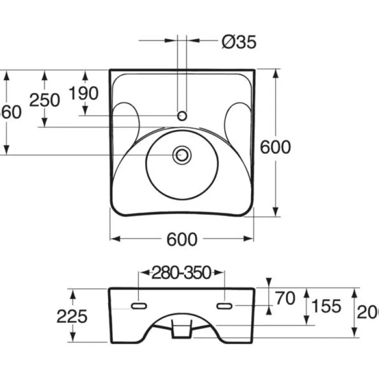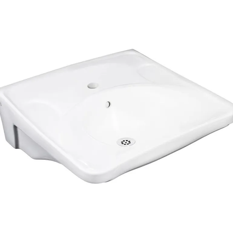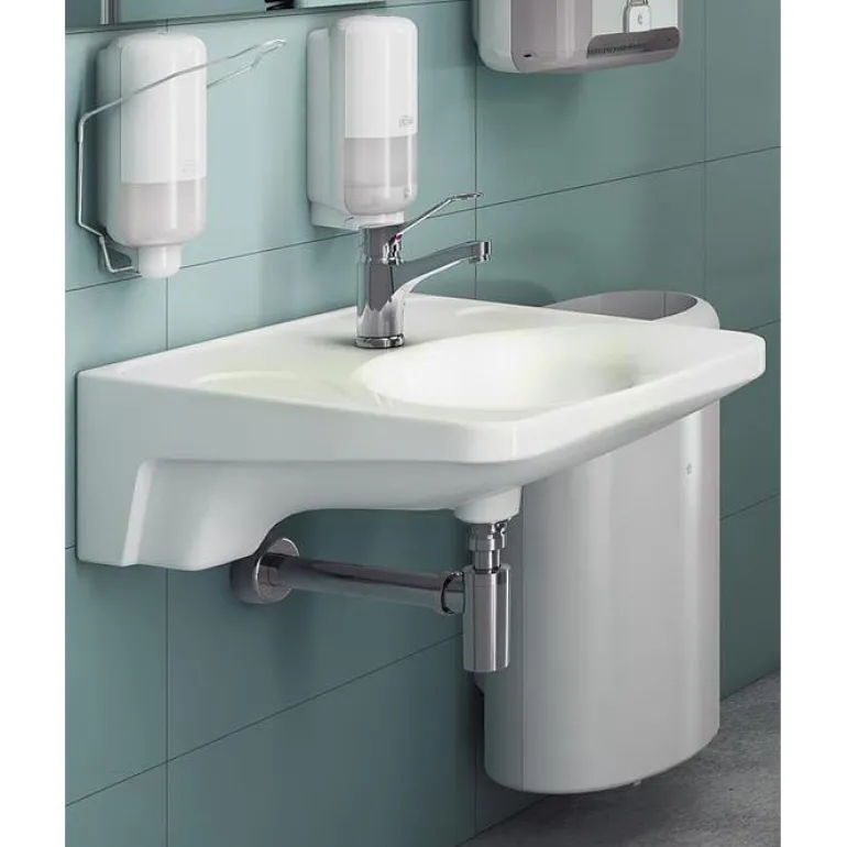 Pyörätuolilla käytettäväksi sopiva, seinään asennettava pesuallas, jossa on matala allas ja sivuilla alueet, joita voidaan käyttää käsinojina. Joustavat pulttimitat 280–350 mm ja mitat 600 x 600 mm (L x S).