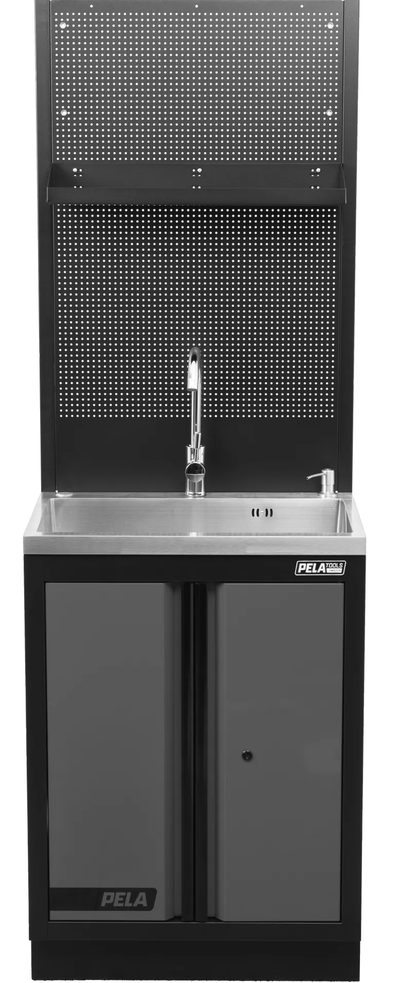 PELA 546476 on ruostumattomasta teräksestä valmistettu pesuallas, jossa pohjakaappi ja hylly ripustettuna työkalutauluun/levyyn. Sopii yhteen PELA 2.0 546213 työpistekalusteen kanssa (harmaa/musta, tuotenro 546213).