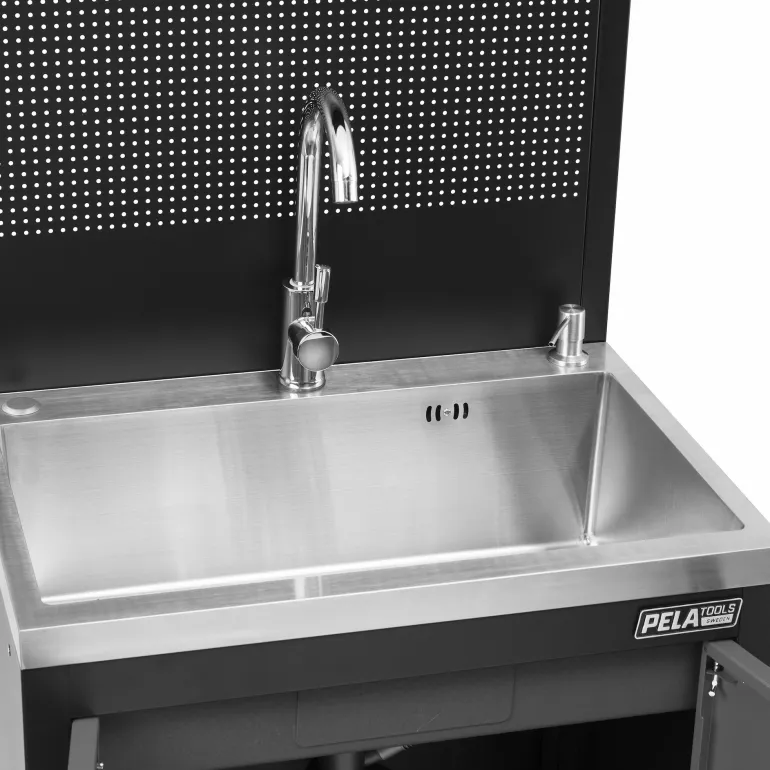 PELA 546476 on ruostumattomasta teräksestä valmistettu pesuallas, jossa pohjakaappi ja hylly ripustettuna työkalutauluun/levyyn. Sopii yhteen PELA 2.0 546213 työpistekalusteen kanssa (harmaa/musta, tuotenro 546213). Pesuallas on varustettu hanalla, koripohjaventtiilillä, tulpalla ja saippua-annostelijalla. Valmisteltu vesiliitäntää varten. Lähin värikoodi punaiselle RAL 7016.