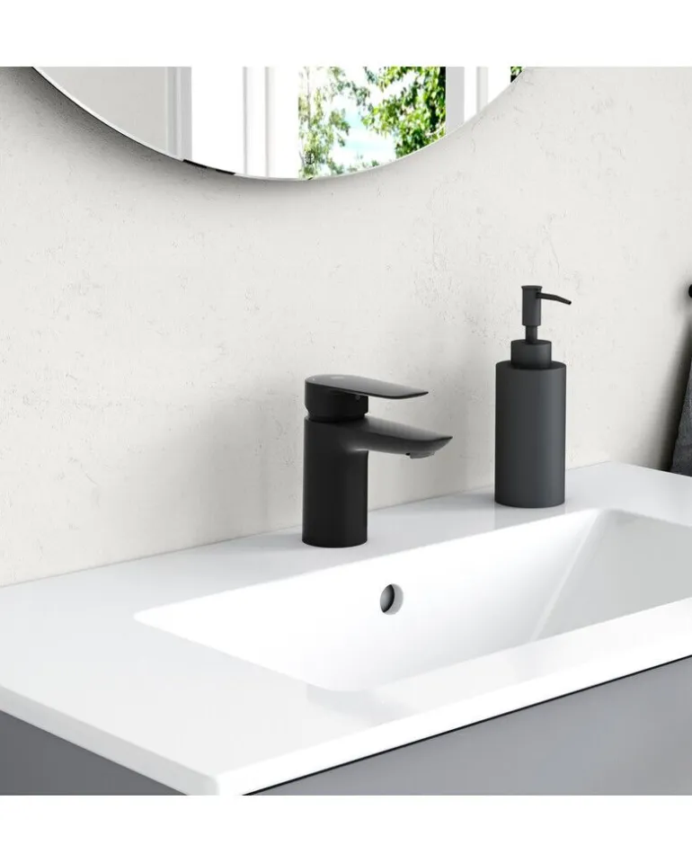 Gustavsberg Atlantic -pesuallashana (mattamusta). Vivussa selkeä värillinen kuuman ja kylmän veden merkintä. Soft move-teknologia saa vivun kääntymään pehmeästi ja tarkasti.
