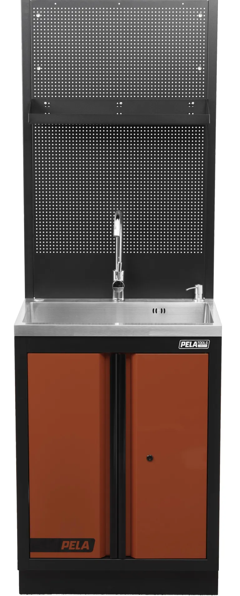 PELA 546475 pesuallaskaappi PELA 2.0-työpistekalusteelle 546214. Moduulissa ruostumattomasta teräksestä valmistettu pesuallas, pohjakaappi ja työkalutaulut (jossa ylhäällä hylly kiinnitettynä työkalutauluun). Pesuallas on varustettu hanalla, korisihdillä, tulpalla ja saippua-annostelijalla. Valmisteltu vesiliitäntää varten. Lähin värikoodi: RAL 3001.
