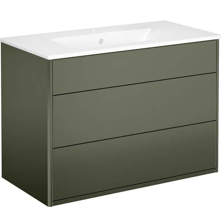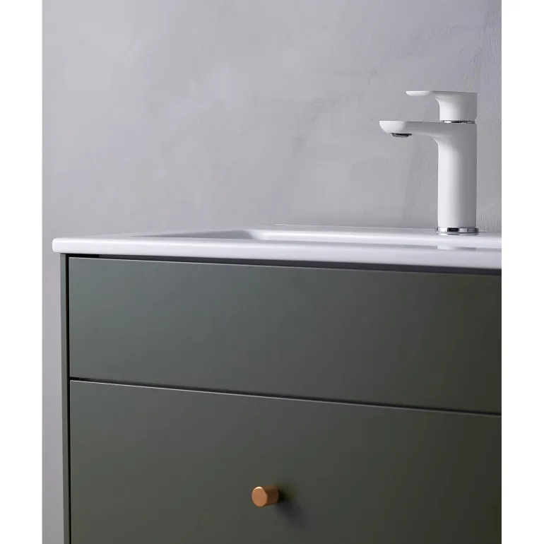 Pesuallaskaappi (80 cm) pehmeästi sulkeutuvilla laatikoilla ja kapealla syvyydellä, joka tekee siitä soveltuvan myös pienempiin kylpyhuoneisiin. Kaapin rungon, ovien ja laatikoiden materiaali on kosteudenkestävää ja kylpyhuoneisiin tarkoitettua MDF-levyä.