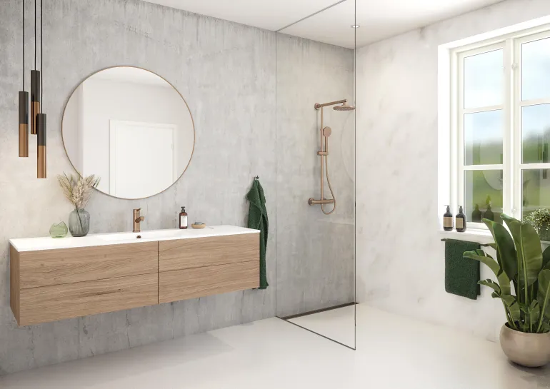 Tyylikäs pesuallashana, harjattu roseekulta. Sopii luontevasti kaiken tyyppisiin kylpyhuoneisiin. GDV-hyväksytty juomavedelle. 35 mm:n keraaminen säätöosa.