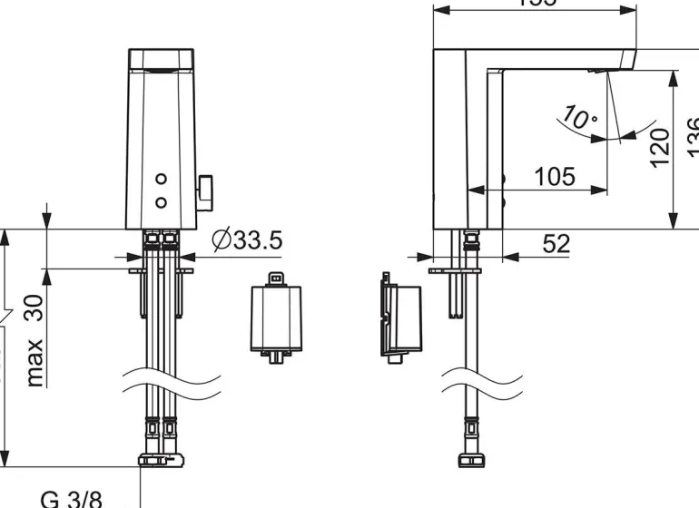 Kosketusvapaa pesuallashana lämpötilan säätimellä. Akun käyttö 6 V.