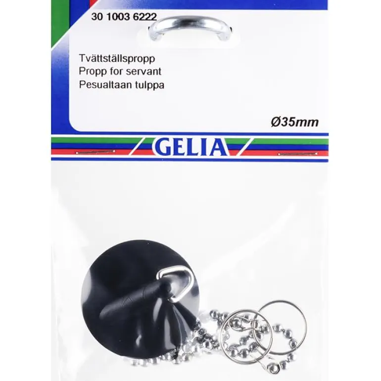 Gelia 3010036222 on pesualtaan tulppa, jossa on kuulaketju ja S-koukku. Voidaan käyttää pesualtaissa, tiskialtaissa ja kylpyammeissa. Tulpassa on kromattu pinta.