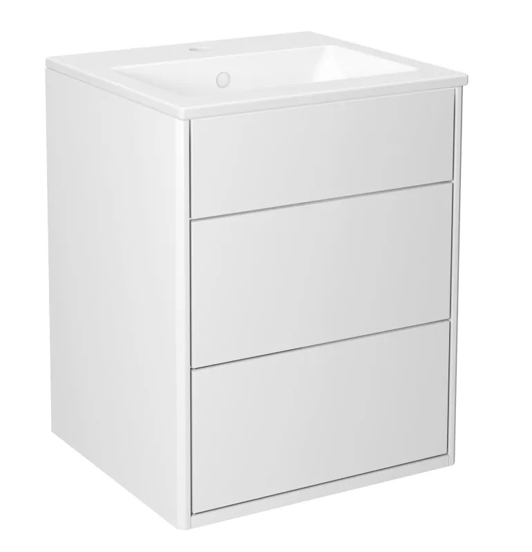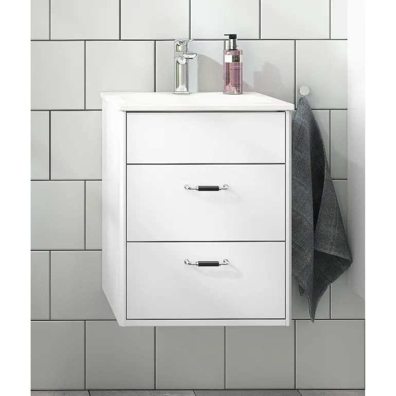45 cm:n valkoinen alalaatikosto, jossa on posliininen pesuallas. Varustettu 2 pehmeästi sulkeutuvalla laatikolla, joissa on täysi ulosveto sekä 1 piilolokero laatikoiden yläpuolella. Piilolokero tarjoaa ylimääräisen laskutilan avattuna.