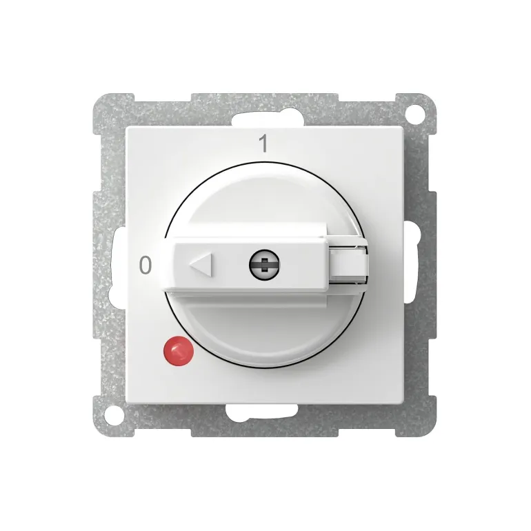 3-napainen valkoinen pesukonekatkaisin nupilla 0-1 ja punaisella merkkivalolla. Liitin on yhdistettävissä, lukittava nuppi ja ruuviliitäntä.