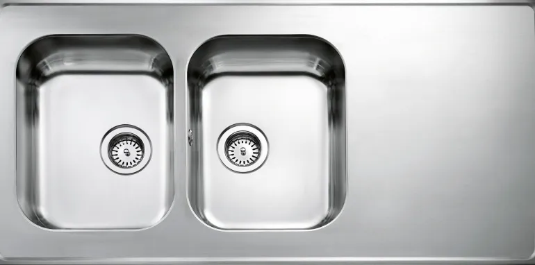 Pesupöytä kahdella isolla altaalla ja kahdella koripohjaventtiilillä. Hanareikä vasemmalla. Sisältää manuaaliset koripohjaventtiilit, ylivuodon (yhdessä altaassa) ja vesilukon.
