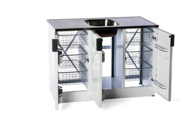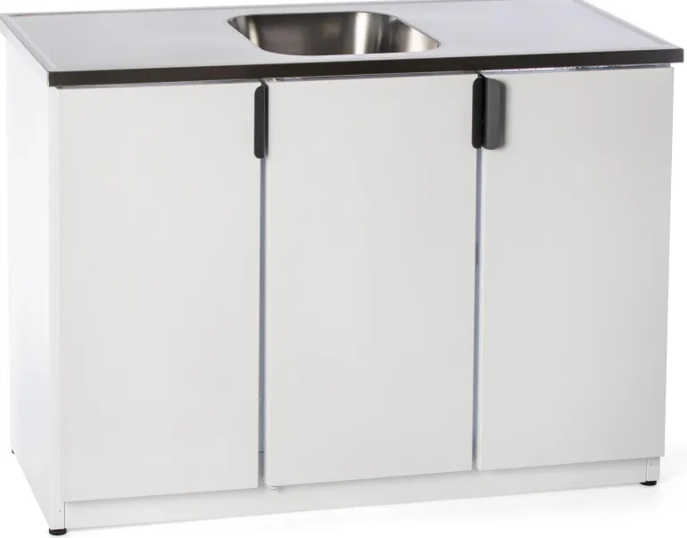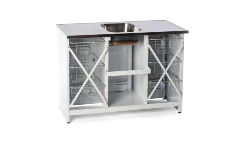 Nimo TB 1200 T on valkoinen pesupöytä/allaskaappi, jonka runko ja sen osat pinnoitettua terästä. Mallissa kolme ovea, kuusi tilavaa verkkokoria, tila pesuaineille, kaksinkertaiset säilytyslokerot ovessa (jossa hidastin, piilosaranat ja lapsilukko) sekä täysin integroitu alusta.