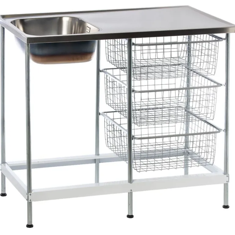Nimo TB 1000 O on avoimen mallinen pesupöytä/allaskaappi, joka sisältää seinäkiinnikkeen lisävakautta varten ja täydellisen viemärisarjan. Mallissa säädettävät jalat, joka mahdollistaa korkeuden säätämisen. Pesupöydässä/allaskaapissa on ruostumattomasta teräksestä valmistettu ja altaalla varustettu pesupöytä (käännettävä), kolme verkkokoria sekä sähkösinkitty teräksinen alusta.