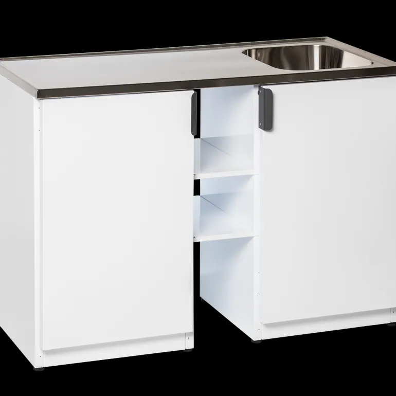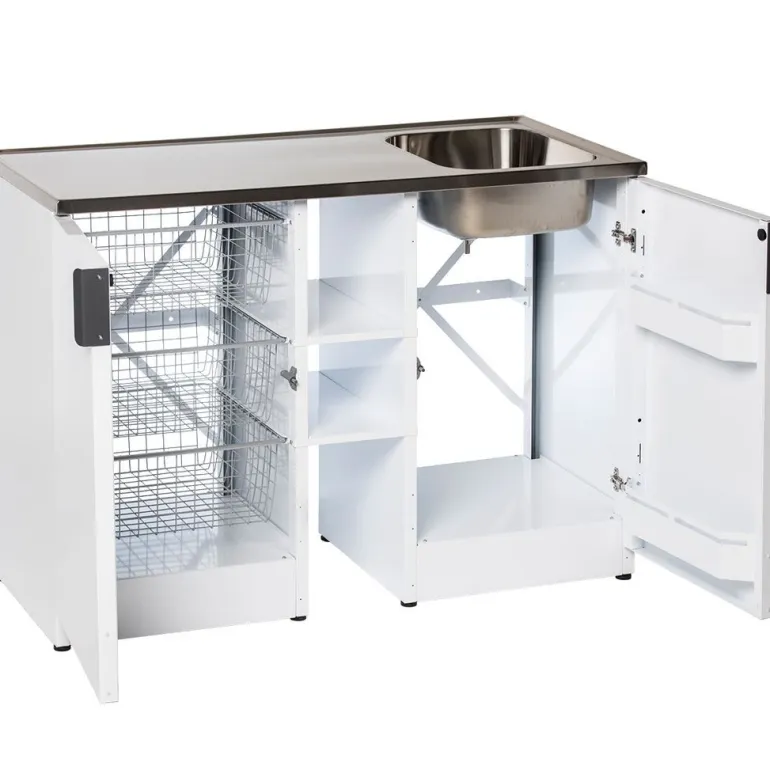 Nimo TB 1200 TMH on valkoinen pesupöytä, jonka runko ja sen osat pinnoitettua terästä. Mallissa on kaksi ovea, kolme tilavaa verkkokoria, tila pesuaineille, kaksinkertaiset säilytyslokerot ovessa (jossa hidastin, piilosaranat ja lapsilukko) sekä täysin integroitu alusta.