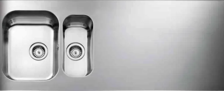 Pesupöytä, jossa yksi iso ja yksi pieni allas oikealla. Mukana koripohjaventtiili ja vesilukko.