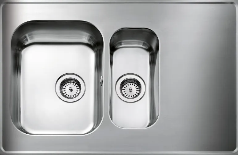 Pesupöytä yhdellä isolla ja yhdellä pienellä altaalla. Sisältää koripohjaventtiilit ja ylivuodon. 60 cm kaappeihin. Altaat oikealla.