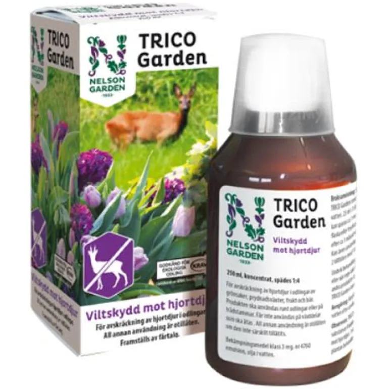 Nelson Garden TRICO Garden on KRAV-hyväksytty, lampaanrasvasta valmistettu tuote, jonka haju ja maku karkottaa hirvieläimet, kuten peurat, ja suojaa siten koristekasveja, vihanneksia, hedelmiä ja marjoja. Tuote tarjoaa pitkäaikaisen suojan ja sitä voidaan käyttää ympäri vuoden. TRICO Garden laimennetaan vedellä pakkauksen ohjeiden mukaan. Tuotetta voidaan käyttää ympäri vuoden viljelmillä sekä puunrungoilla, mutta ei syötävissä kasvinosissa. Vältä käsittelyä auringonpaisteessa tai kun kasvi on märkä tai silloin, kun sadetta on odotettavissa.