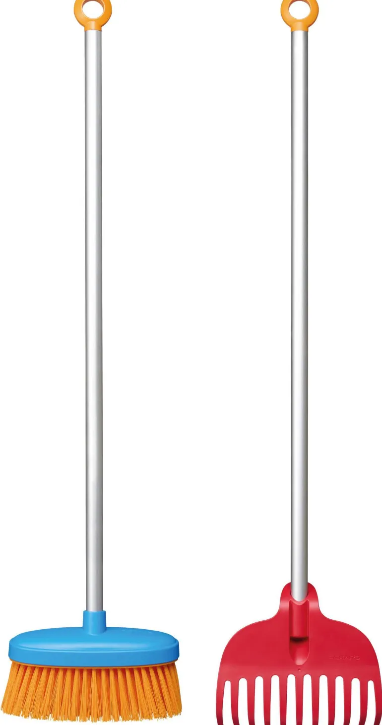 My First Fiskars -pihanhoitosetti sisältää lasten käsille sopivan harjan ja haravan. Kestävät muoviset harjan ja haravan päät ovat turvalliset käytössä. Molemmista työkaluista löytyy kevyt, ruosteen- ja säänkestävä alumiinikahva sekä kestävä, kierrätysmuovinen pää.