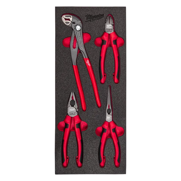 Milwaukee 4932493631 on 4-osainen pihtisarja vaahtomuovialustalla.