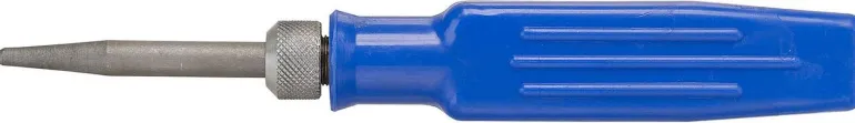 Kovametallikärki. Terä on käännettävissä ja sen voi työntää varren sisään. Kahva muovia. Halkaisija: 7 mm. Pituus: 90 mm.