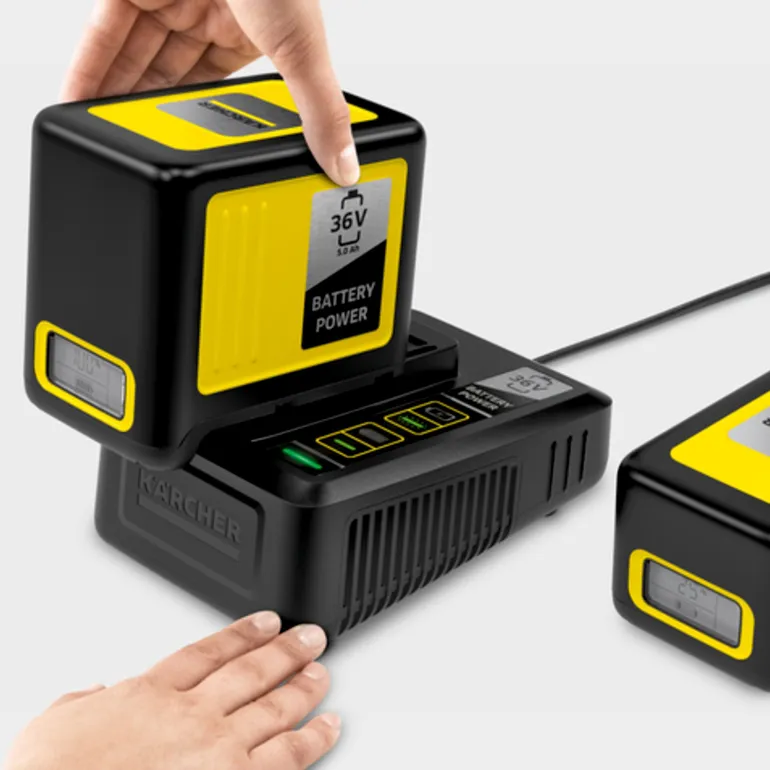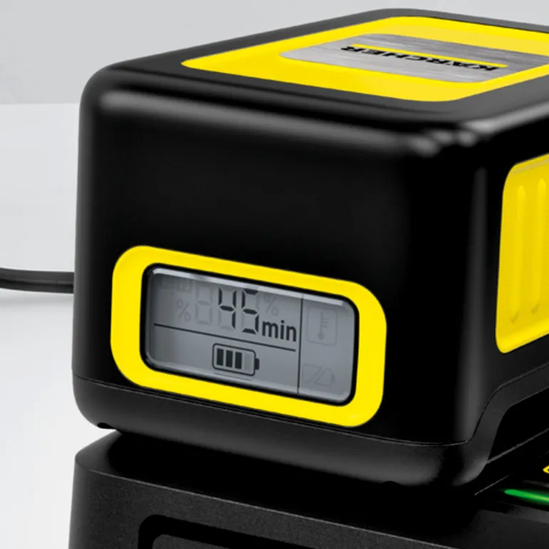 Kärcher 24450330 on käytännöllinen pikalatauslaite, joka voidaan kiinnittää helposti seinään integroidun seinäkiinnikkeen avulla. Pikalatauslaite lataa 36V/2,5 Ah litiumioniakun 80 %:iin vain 48 minuutissa.
