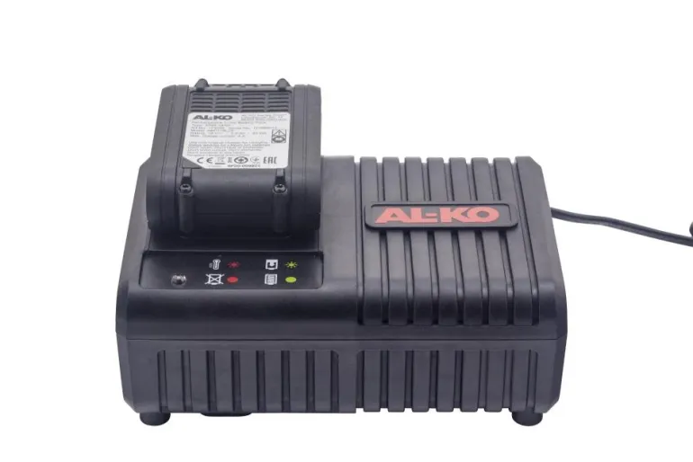 Pikalaturi AL-KO: n Easy Flex 20V -sarjaan, sopii sekä 2,5 että 5,0 Ah akkuihin. Laturi näyttää LED-valolla, kun akku on ladattu täyteen. Jos käytät ja lataat useita akkuja, voit hoitaa puutarhaasi keskeytyksettä.