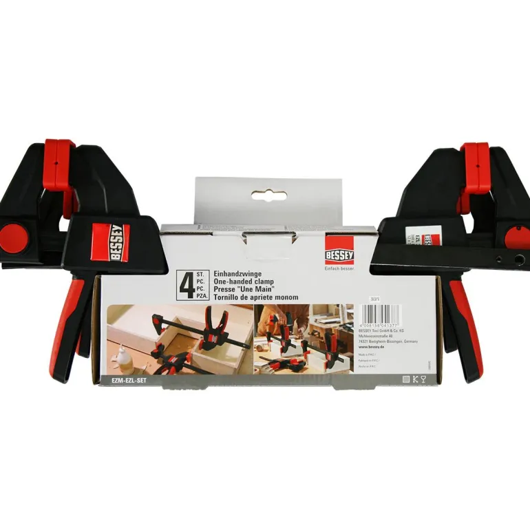 Sarja, joka sisältää 4 kpl EZ pikapuristinta. Säätö ilman työkaluja ulko-/sisäpuristukselle kiinteän leuan irrotusmekanismin ansiosta.