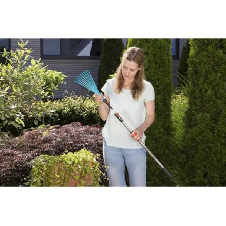 GARDENA Combisystem on 12 cm leveä pikkuharava, joka on täydellinen työväline lehtien, rikkakasvien ja leikkuujätteen haravointiin kukkapenkeistä ja hankalasti ulottuvilla olevilta alueilta. Erittäin mukava pehmeillä muoviosilla varustettu ergonominen kahva pysyy varmasti kädessä, ja kahvan taivutettu pää estää kättä luisumasta. Jos et halua kumarrella työskennellessäsi, kahva voidaan helposti vaihtaa pidempään Combisystem-varteen. Duroplast-pinnoite takaa pitkän käyttöiän.
