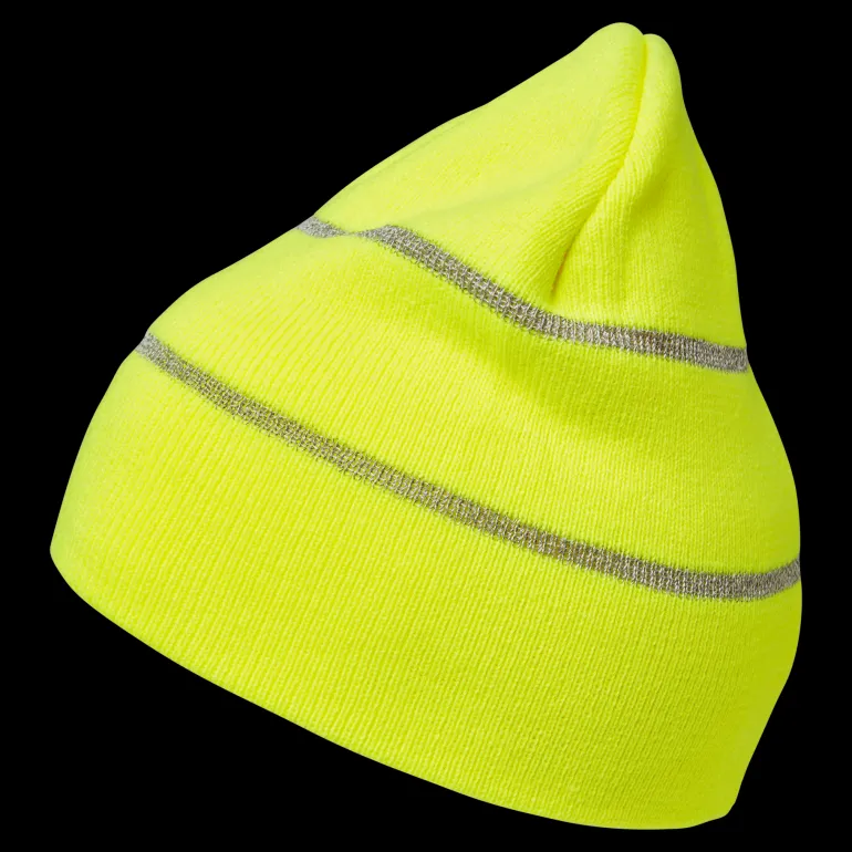 Lämmin pipo heijastinraidoilla näkyvyyden parantamiseksi. Ribbineulottu. One size. Materiaali: 100 % akryyli.