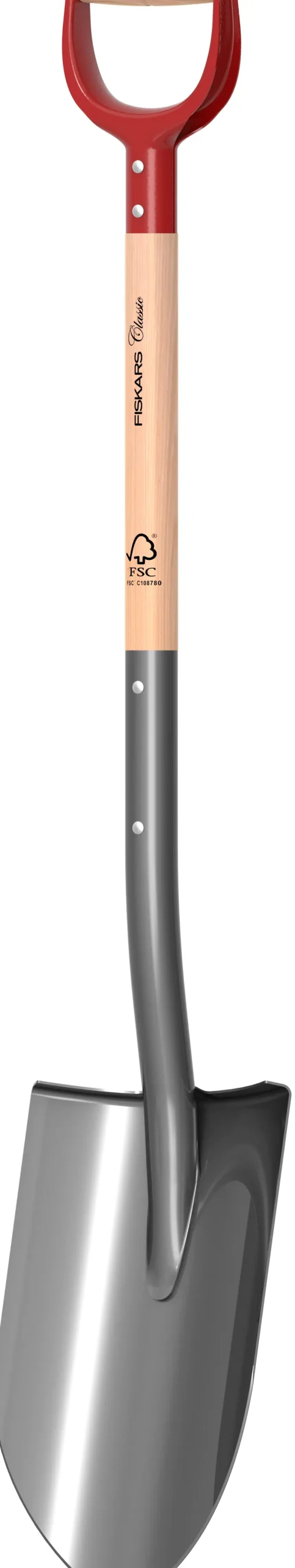 Fiskars Classic Pro -pistolapio terävällä kärjellä ja reunoilla, joka työntyy vaivatta kovaankin maahan. Tukeva D-kahva lisää käyttömukavuutta. Muotoilultaan klassisen ajaton.