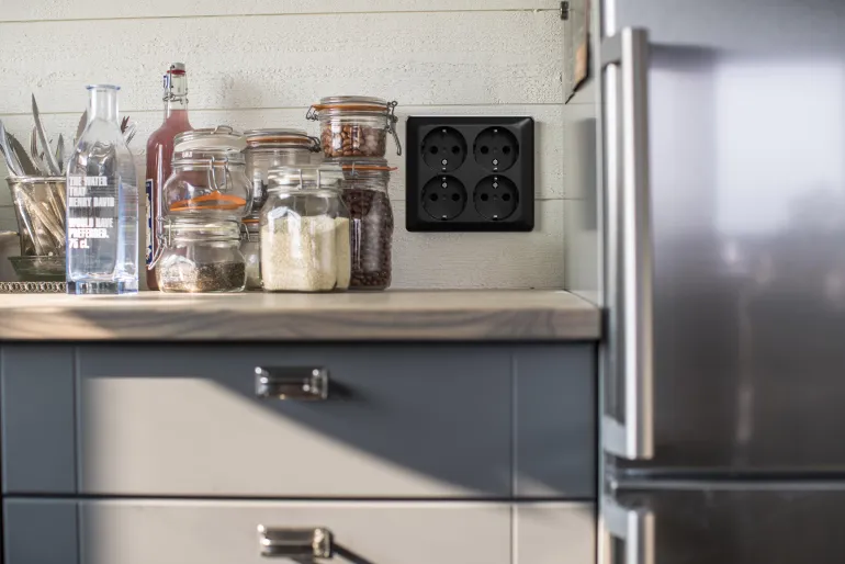 Musta 4-osainen pistorasia, joka on maadoitettu ja tarkoitettu pinta-asennettavaksi. IP-luokitus on IP21 ja varustettu neljällä sukopistokkeella. Pohja, kansi ja taustalevy on valmistettu halogeenittomasta kestomuovista. Kaksinkertaiset (x2) ruuviliitännät vaihetta kohti. Voidaan asentaa suoraan seinälle tai kojerasian päälle. Kahta pistorasiapesää voidaan ohjata kytkimellä ja valmistajalta löytyy vedonpoistonysä lisätarvikkeena.