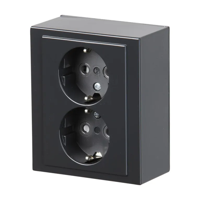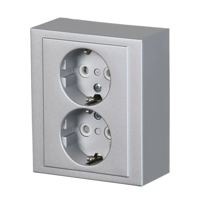 Impressivo -sarjan 2-osainen maadoitettu pistorasia pinta-asennukseen. Pistorasiassa on liittimet kutakin kosketinta kohden ja niihin voi kytkeä max. 4 johtoa (haaroitusmahdollisuus). Liittimet on hyväksytty ML- ja MK -johtimille. Ei potentiaalivapaita liittimiä. Lapsisuojat on integroitu pistorasian runkoon. IP21 -tiiveys saavutetaan vain jos kaapeli tuodaan alhaalta. Jousiliittimet, alumiini.