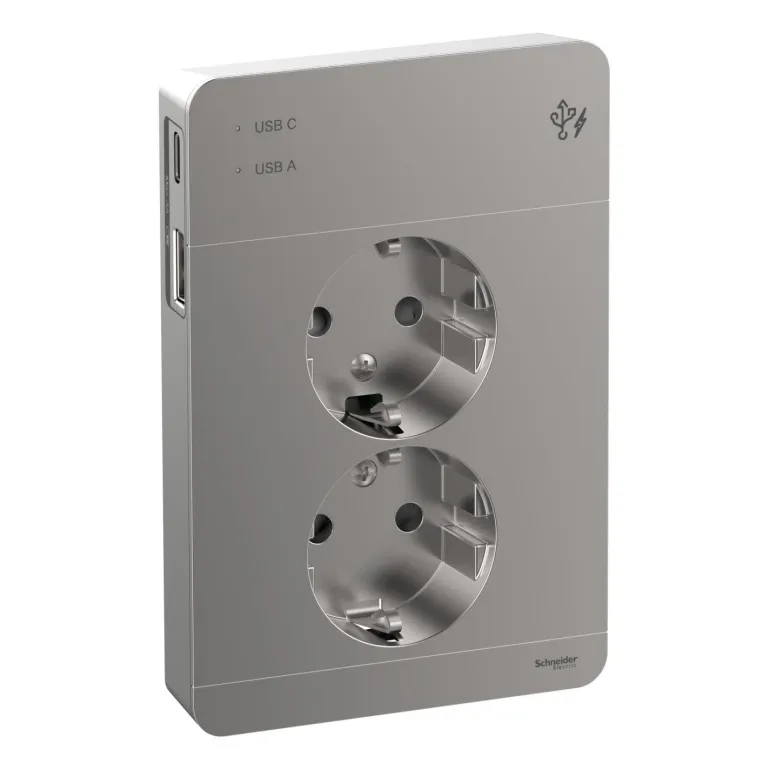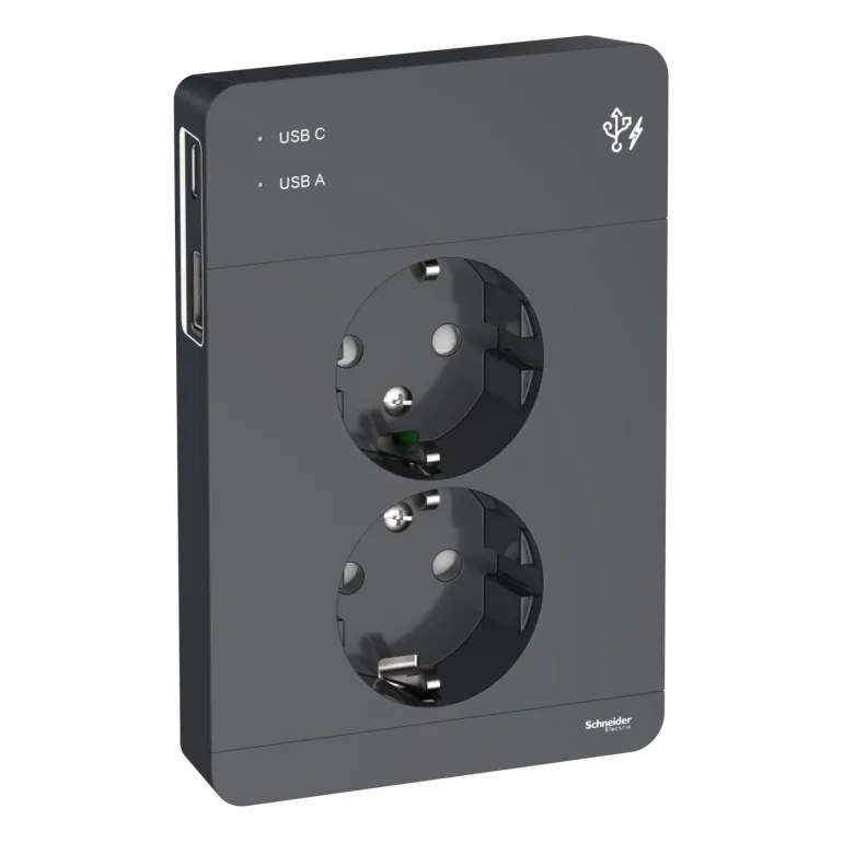 Schneider Electric Exxact on 2-osainen seinäpistorasia, joka on maadoitettu 16 A. Seinäpistorasia on varustettu USB-latauksella, tyyppi A + C (enintään 2,4 A tyypille A ja enintään 3 A tyypille C).