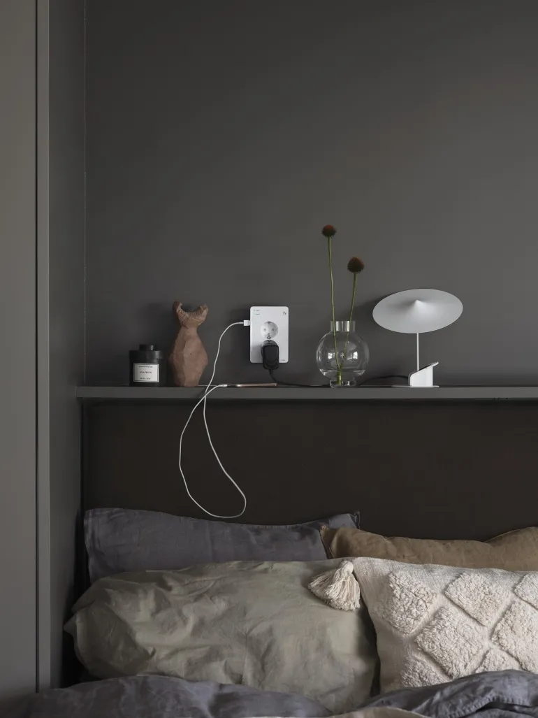 2-osainen seinäpistorasia, joka on maadoitettu 16 A. Seinäpistorasia on varustettu USB-latauksella, tyyppi A + C (enintään 2,4 A tyypille A ja enintään 3 A tyypille C). Pistorasiassa on oranssi LED-valo, joka ilmoittaa, kun puhelin/laite latautuu.