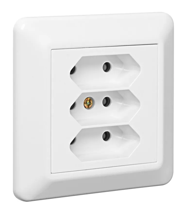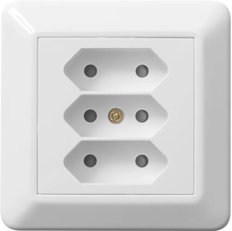 Valkoinen uppoasennettava pistorasia. Valmistettu halogeenittomasta kestomuovista. Kaksinkertaiset liitännät vaihetta kohti.