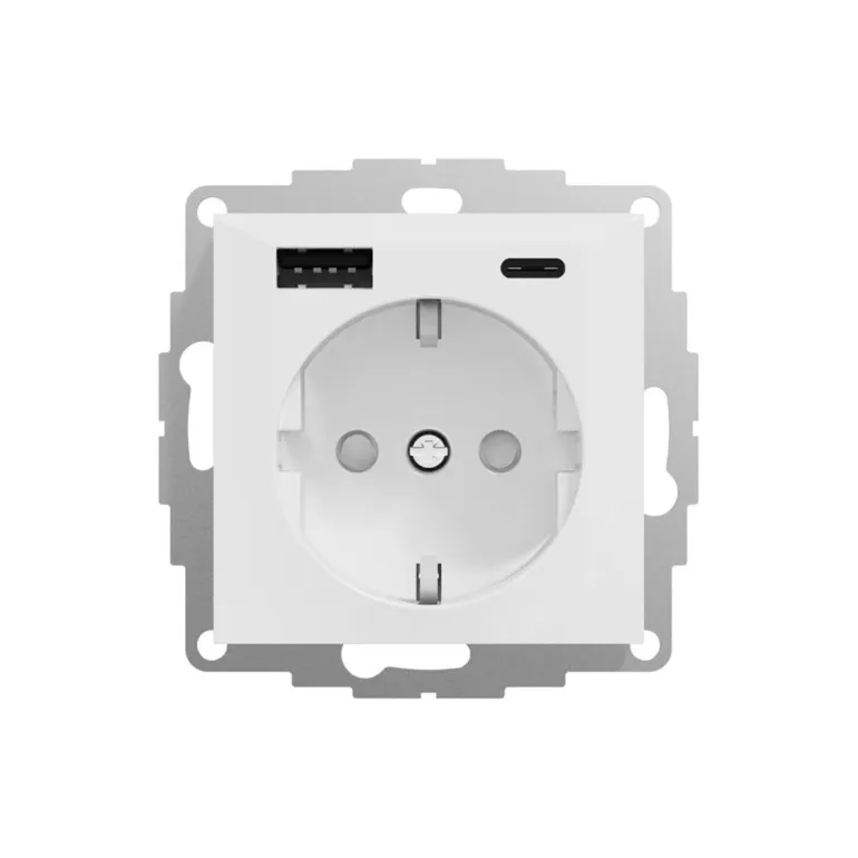 Pistorasia varustettu yhdellä suko-pistorasialla sekä USB A- ja C-latausporteilla. Tuote sopii maadoitetuille käyttökohteille.