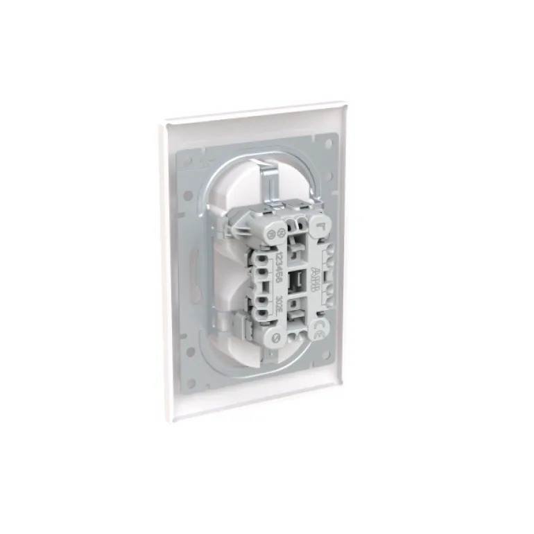 SAGA™ matala 2-osainen pistorasia peitelevyllä. Kokopeitelevyn valmistukseen on käytetty biopohjaista muovia.