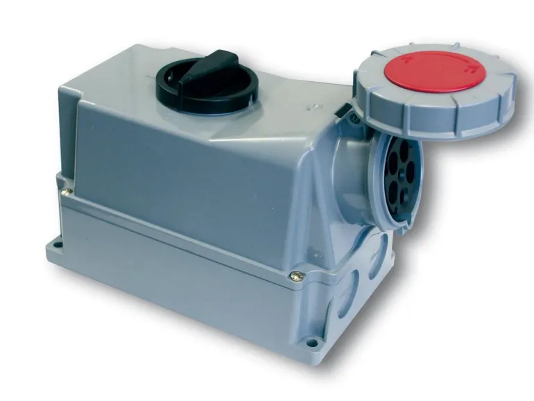 Vedenpitävä eristetty pistorasia seinäasennukseen IEC/CEE-liitännällä edessä. Lukittavissa päälle ja pois päältä -tilaan, runsaasti kytkintilaa ja FL13 ylä- ja alareunassa aihioilla.