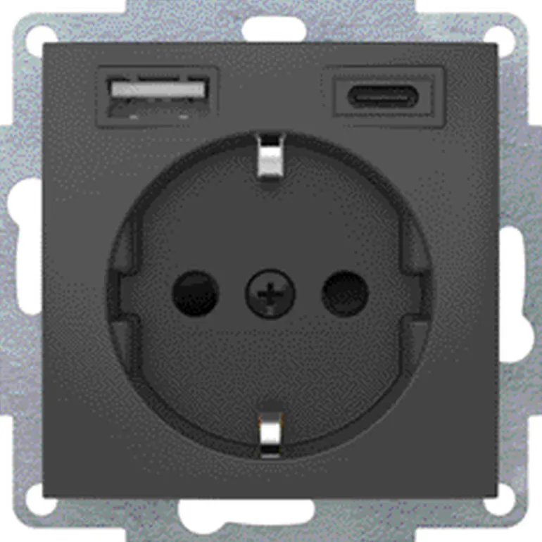 Pistorasia 1-osainen 2:lla USB-liittimellä tyyppi A (2,4A) ja tyyppi C (3,0A) mobiililaitteiden kuten tablettien, älypuhelinten, navigointilaitteiden ja digitaalikameroiden lataamiseen USB-kaapelin kanssa. USB-liitynnät on oikosulku- ja ylikuormitussuojattu (elektroninen sulake). Rasian asennus uppoasennukseen kojerasiaan tai pinta-asennukseen pinta-asennusrasian kanssa. Tuote voidaan asentaa joko ruuvikiinnityksellä tai kiinnityskynsillä. Liitynnät jousiliittimin.
