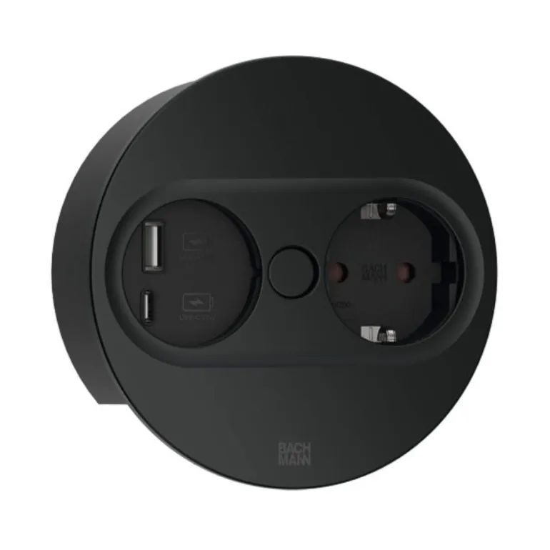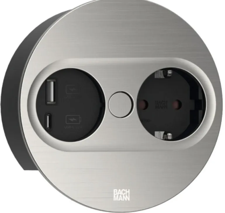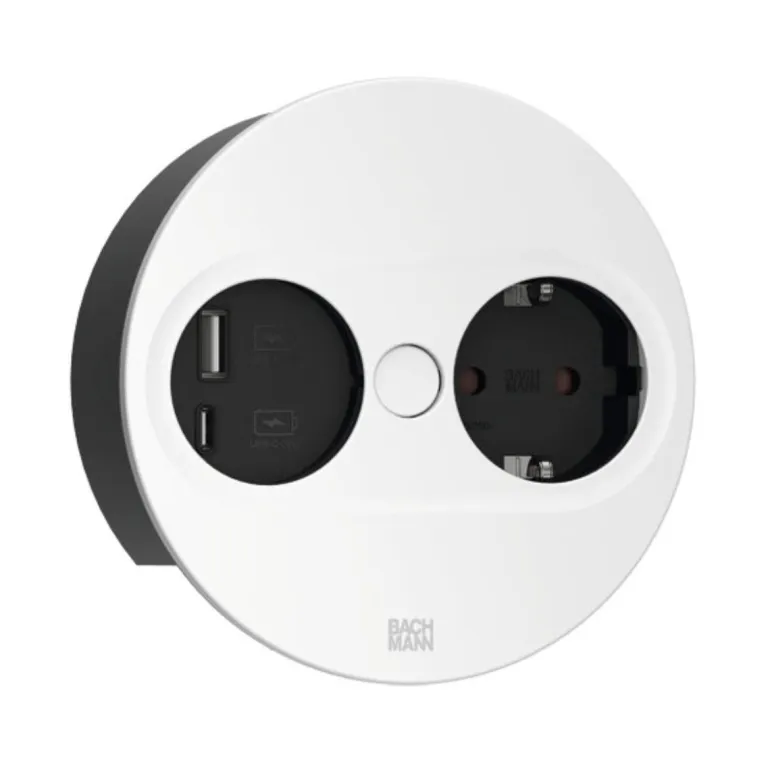 Rutab TWIST2 on pistorasia Schuko-pistorasialla sekä USB A- ja USB C-porteilla. Upotusleveys 105 mm (halkaisija) ja -syvyys 40 mm. Asennettavaksi pöytään tai muuhun tasoon/levyyn.