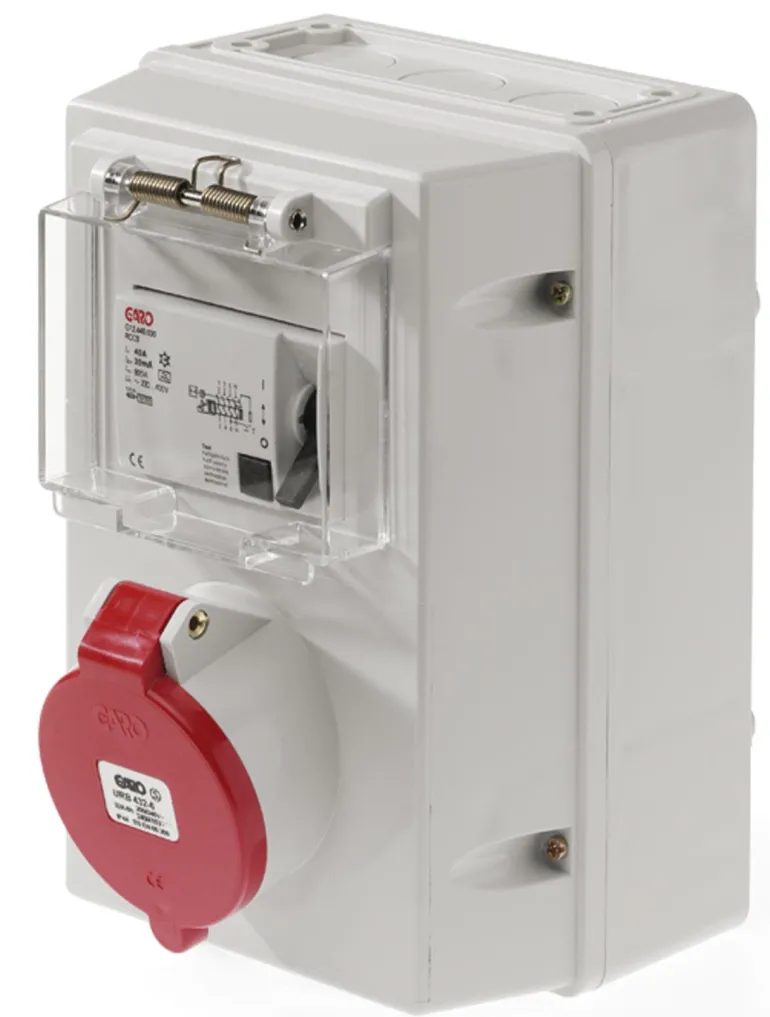 Pistorasiakotelo, jossa IEC/CEE-pistorasia edessä ja runsaasti kytkentätilaa. FL13 ylä- ja alaosassa yhdistettynä knockoutseihin.