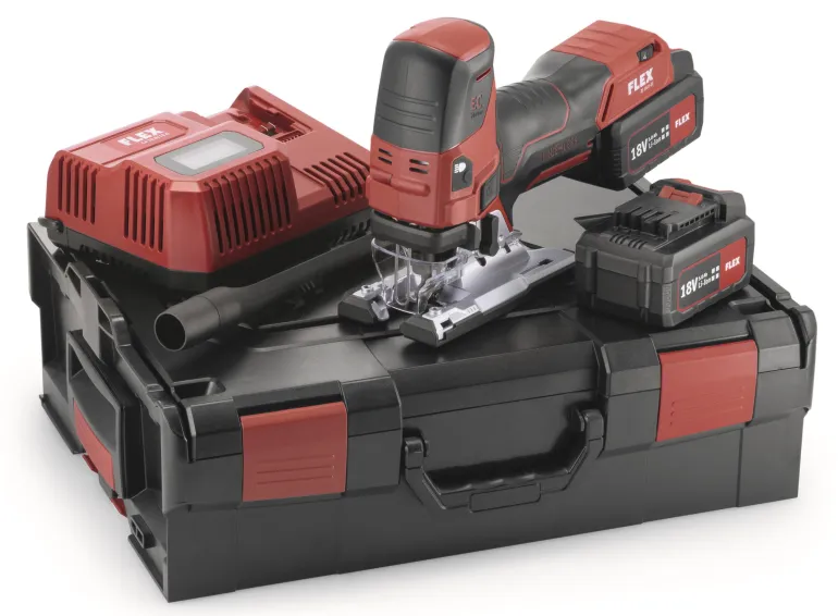 FLEX JS18.0-EC Set on 18 V pistosaha kuormittamattomalla nopeudella 0-3500 kierr./min, varustettu harjattomalla moottorilla ja EMS-elektronisella ohjausjärjestelmällä, joka suojaa konetta ja pidentää sen käyttöikää. Sahassa on automaattinen käynnistys, ylikuormitussuoja ja portaaton sahan nopeuden asetus. Mukana toimitetaan akut, laturi ja tarvikkeita kuljetuslaukussa.