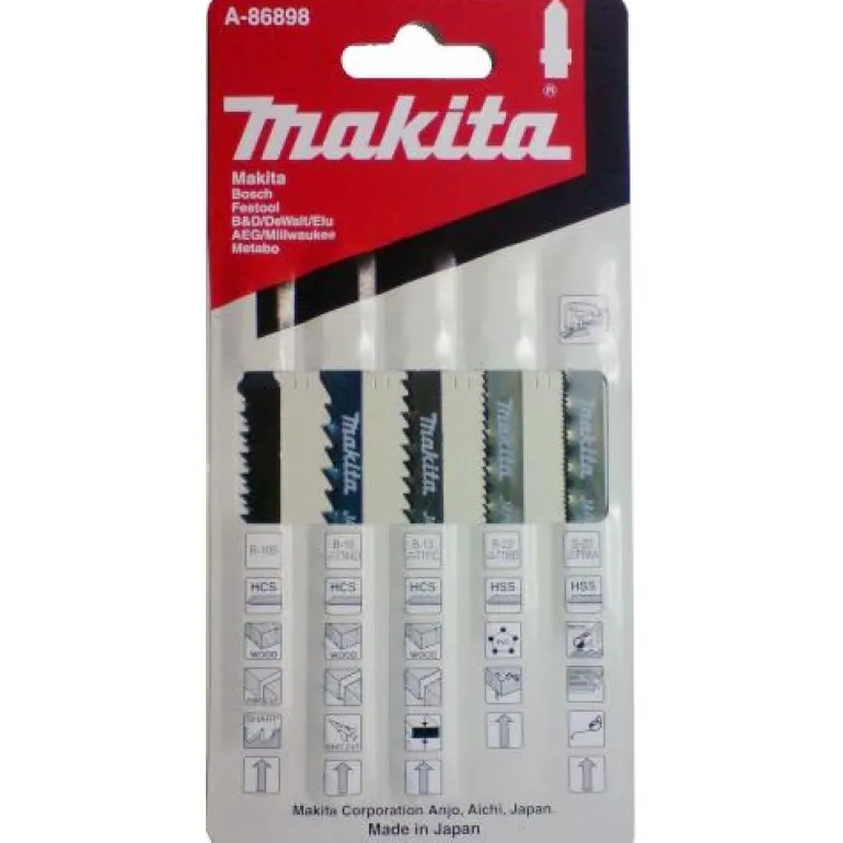 Erilaisia pistosahanteriä, 5 kpl. Puun ja metallin sahaukseen. Valikoimapakkaus sisältää Makitan 5 suosituinta terää. Ominaisuudet Käyttökohteet: Puun työstö, johdot, metallipelti.Joustava, sopii moniin puu- ja metallikohteisiin. Sisältö 1st B221st B231st B131st B161st B105