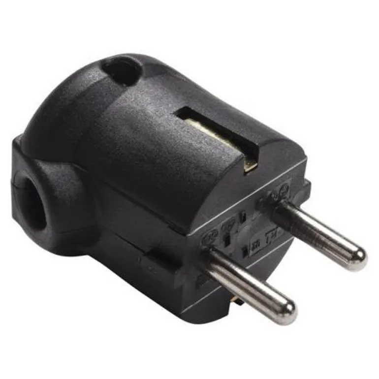 ABL 1107100 on 2-napainen maadoitettu pistoke nimellisvirralla16A ja nimellisjännitteelle 250 V. Kaapelin sisäänmeno kulmassa, suojausluokka IP21.
