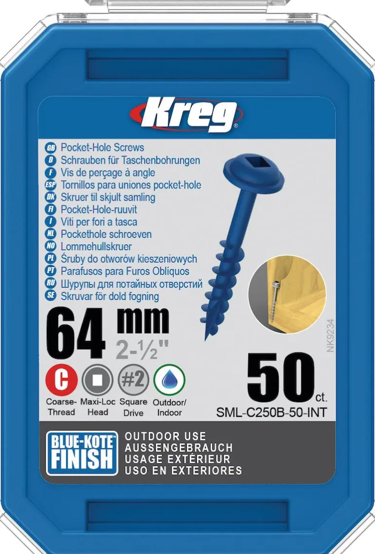 Kreg Blue-Kote® Pocket-Hole-ruuvi kolmella korroosionestokerroksella, joten ne ovat täydellinen valinta erilaisiin sisä- ja ulkoprojekteihin. Tarjoaa jopa 400 % paremman korroosiosuojan kuin sinkityt ruuvit. Voidaan käyttää painekyllästettyihin materiaaleihin.
