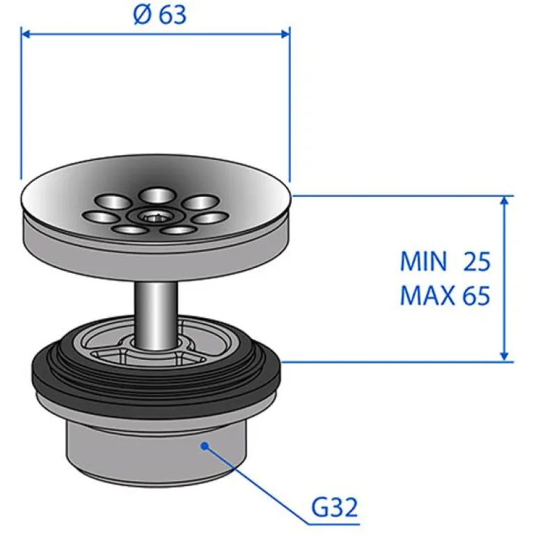 Pohjaventtiili ylivuotoaukolla pesualtaille. Venttiilin halkaisija on 63 mm ja mitta 25–65 mm. G32-ulkokierre. Ilman tulppaa.