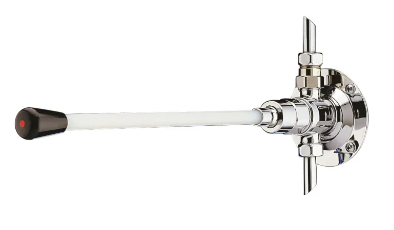 Itsesulkeutuva polviventtiili vivulla, huuhteluaika noin 15 sekuntia. Ulkonema seinästä 390 mm. Krominvärinen.