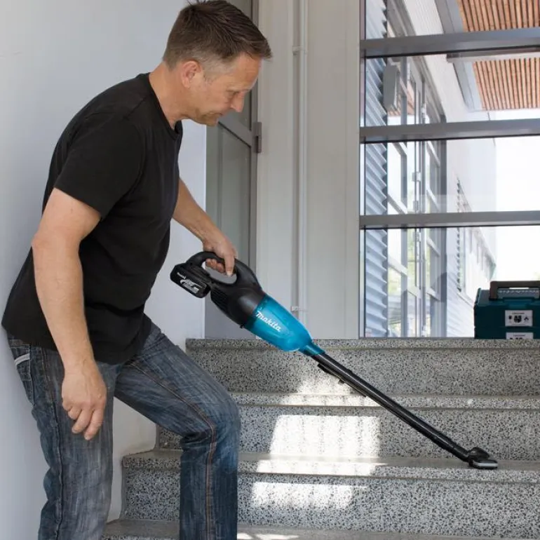 Makita DCL180ZB on akkukäyttöinen imuri 18 V, jonka kapasiteetti on 650 ml ja käyttöaika 20 min.