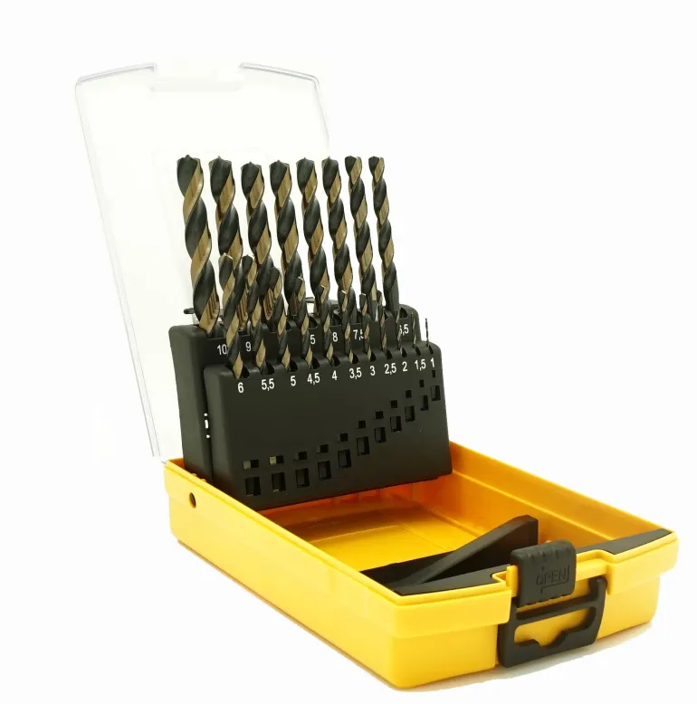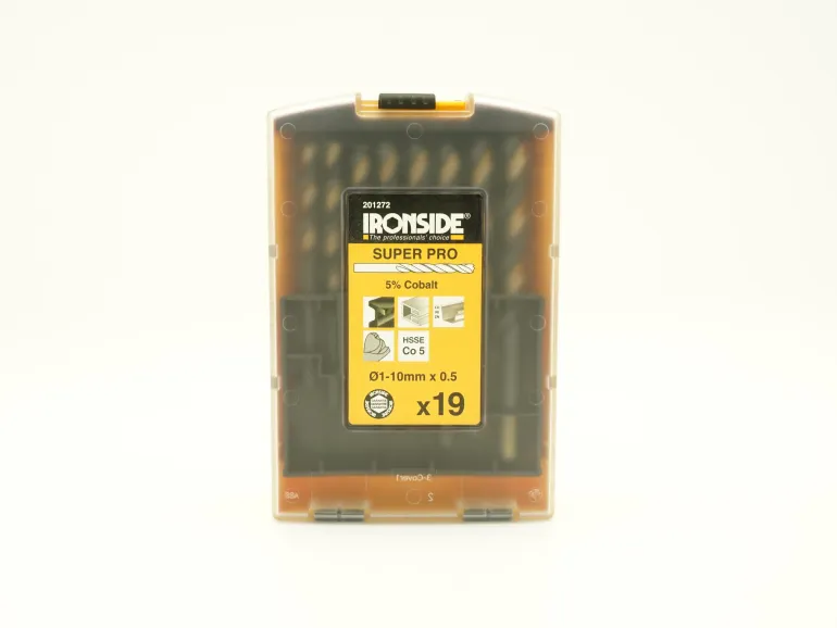 Muovilaatikko läpinäkyvällä kannella, 19 erikoishiottua korkealaatuista pikateräsporaa. HSS 5% kobolttia.
